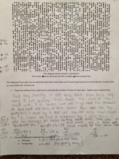 I have made it a priority to provide my students with opportunities to engage in mathematical modeling tasks this year. I wrote about our first modeling experience back in August (What Do You Mean, There's No Right Answer?!?) and since then, I have noticed that students are more willing to take risks, try a variety of methods, and overall be less comfortable (that's when I know they're learning). Last week, I gave them a task called "Counting Trees" from the Mathematics Assessment Project website. This particular task necessitates the use of estimation and communicating reasoning; two skills that I know my students need to work on.